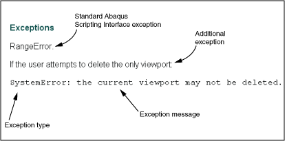 Each command in the API Reference lists the standard Abaqus Scripting Interface exceptions that can be raised by a command. In addition, if the exception is not a standard Python or Abaqus Scripting Interface exception, the description lists the following: